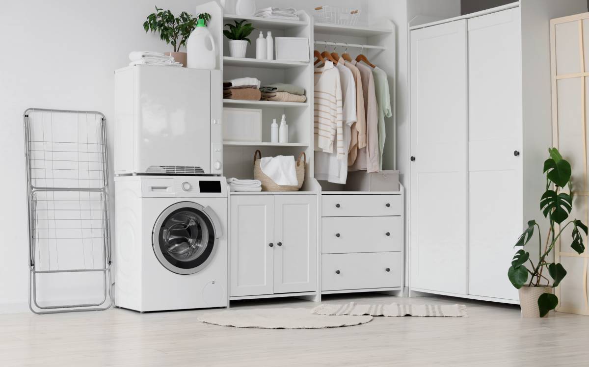 Además, conviene evitar los espacios desaprovechados, especialmente sobre los electrodomésticos. Por ejemplo, si contamos con una lavadora o secadora de carga frontal, podemos instalar encima una superficie de madera o melamina que sirva tanto de apoyo como de zona de trabajo para doblar la ropa. También es útil colocar una barra sencilla entre dos armarios o bajo un estante para colgar las prendas en perchas justo al sacarlas de la secadora.