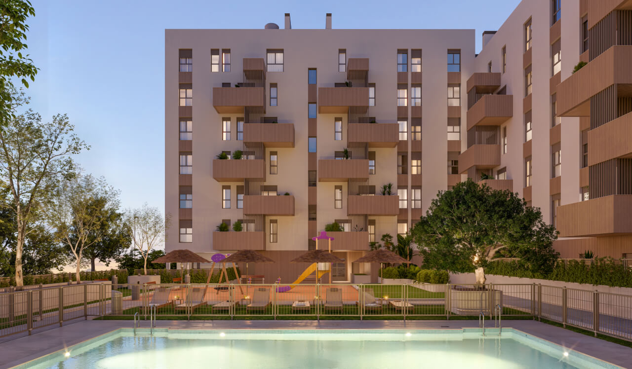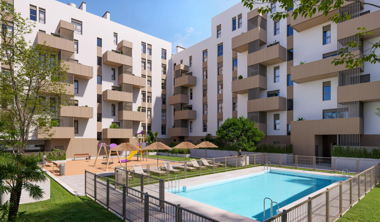 The project offers excellent communal areas, sports court, swimming pool, bicycle area, social-gourmet room, and gym. In addition, the development includes an outdoor garden area with children’s games, where they can enjoy in a protected environment.