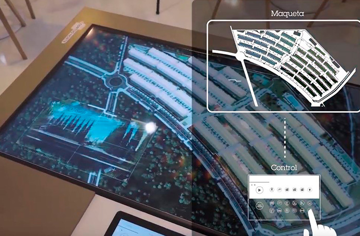 Esta pantalla te permite proyectar cualquier tipo de imagen, desde la información detallada del proyecto hasta un recorrido virtual por cada una de las partes de la urbanización.